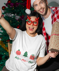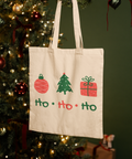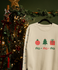 Featuring a cozy Christmas ornament, a cute tree, and a wrapped present — all paired with colorful “Ho • Ho • Ho” lettering — this design brings classic Christmas charm in a clean, modern style.