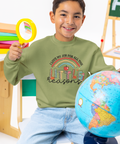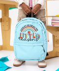 Bright, bubbly, and bursting with color — this design celebrates curiosity and creativity! The playful mix of cheetah prints, rainbow arcs, and classroom symbols (the apple and pencil) makes it perfect for kids, teachers, or parents who live for that “first day of school” energy.