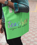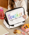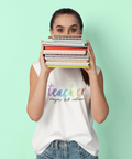 This design features a soft rainbow gradient background paired with hand-drawn style typography spelling “TEACHER”, followed by the relatable phrase