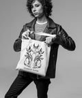 The botanical elements growing from each figure suggest evolution through connection: love as something that doesn’t consume, but nourishes. The stark white linework against deep black creates a ritual-like contrast, evoking ancient symbols, sacred geometry, and timeless devotion.