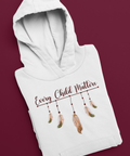 This Every Child Matters design uses hanging feathers as a symbol of remembrance, connection, and responsibility. The horizontal line represents continuity and shared history, while each feather below reflects an individual life—unique, valued, and never forgotten.