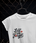 This design tells a quiet story — a soldier’s helmet resting on the grass, surrounded by poppies in bloom. The hand-lettered “Lest we forget” flows softly beneath, turning remembrance into poetry. Each symbol carries weight: the helmet for sacrifice, the flowers for life that endures, the words for gratitude that never fades.